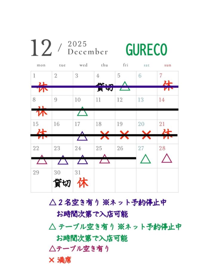 12/27 早め満席・19:45以降なら最大6名可能